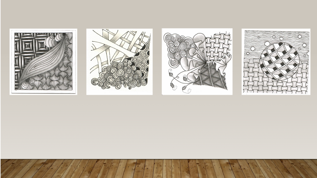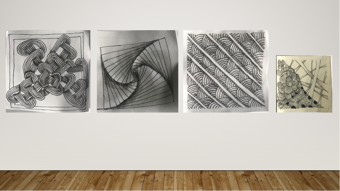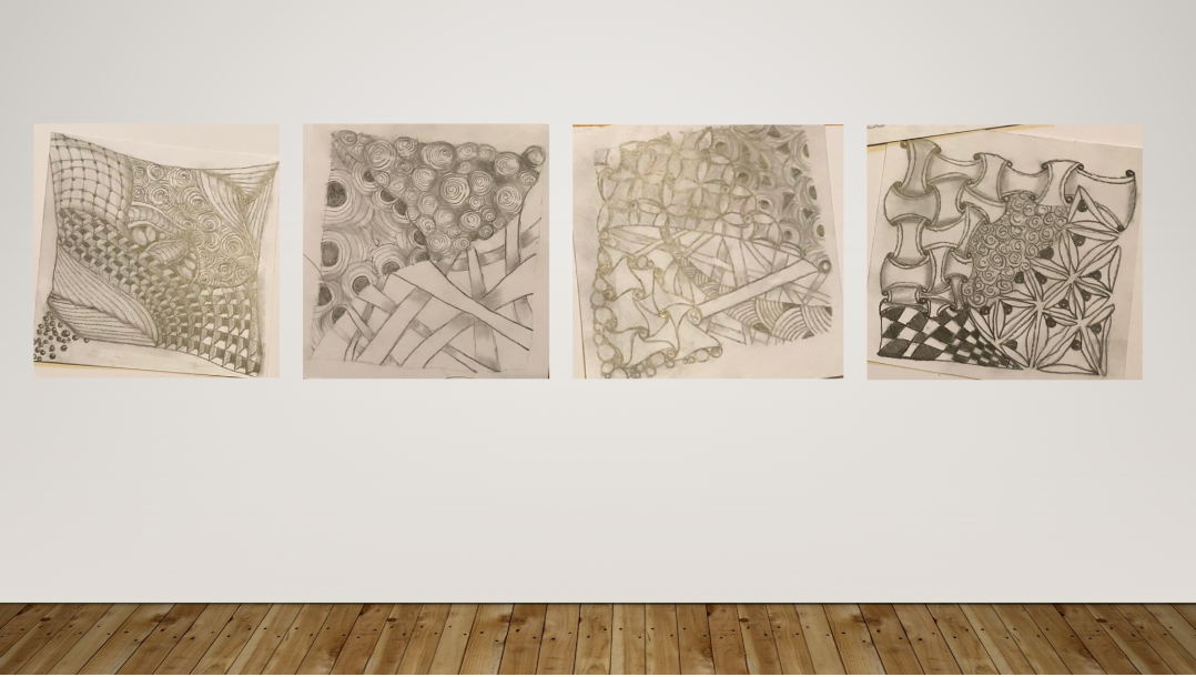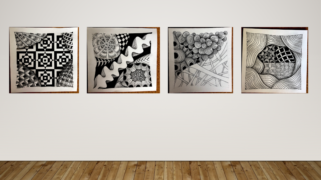 Ein Zentangle ist eine Miniaturform abstrakter Kunst. Es entsteht aus einer Ansammlung von Mustern, die nichts weiter darstellen sollen. Man braucht hierfür nur einen kleinen quadratischen Bogen Zeichenpapier (8 x 8 cm), Stift und Bleistift. Die Schüler*innen der 10b und 10d haben diese Kunstform in diesem Schuljahr im Unterricht ausprobiert und eine wirklich zauberhafte Sammlung erschaffen, die es wert ist, in einer Galerie gezeigt zu werden.