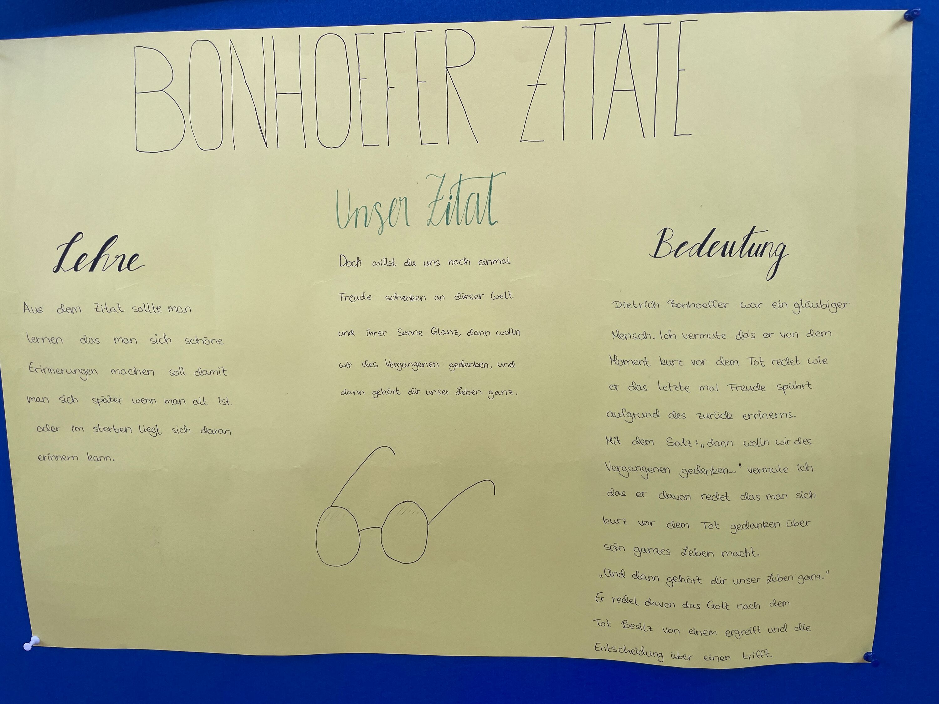 Die Präsentation in der Aula am Freitag war dann der feierliche Abschluss. Es wurden Kurzfilme, Plakate, Bonhoefferkarten und Podcasts präsentiert. Ein kreatives Interview zu Bonhoeffer ist hier zu sehen. Zum Schluss wurden die beliebtesten Bonhoefferzitate des Jahrgangs, die in der Schule verewigt werden sollen, gekürt.