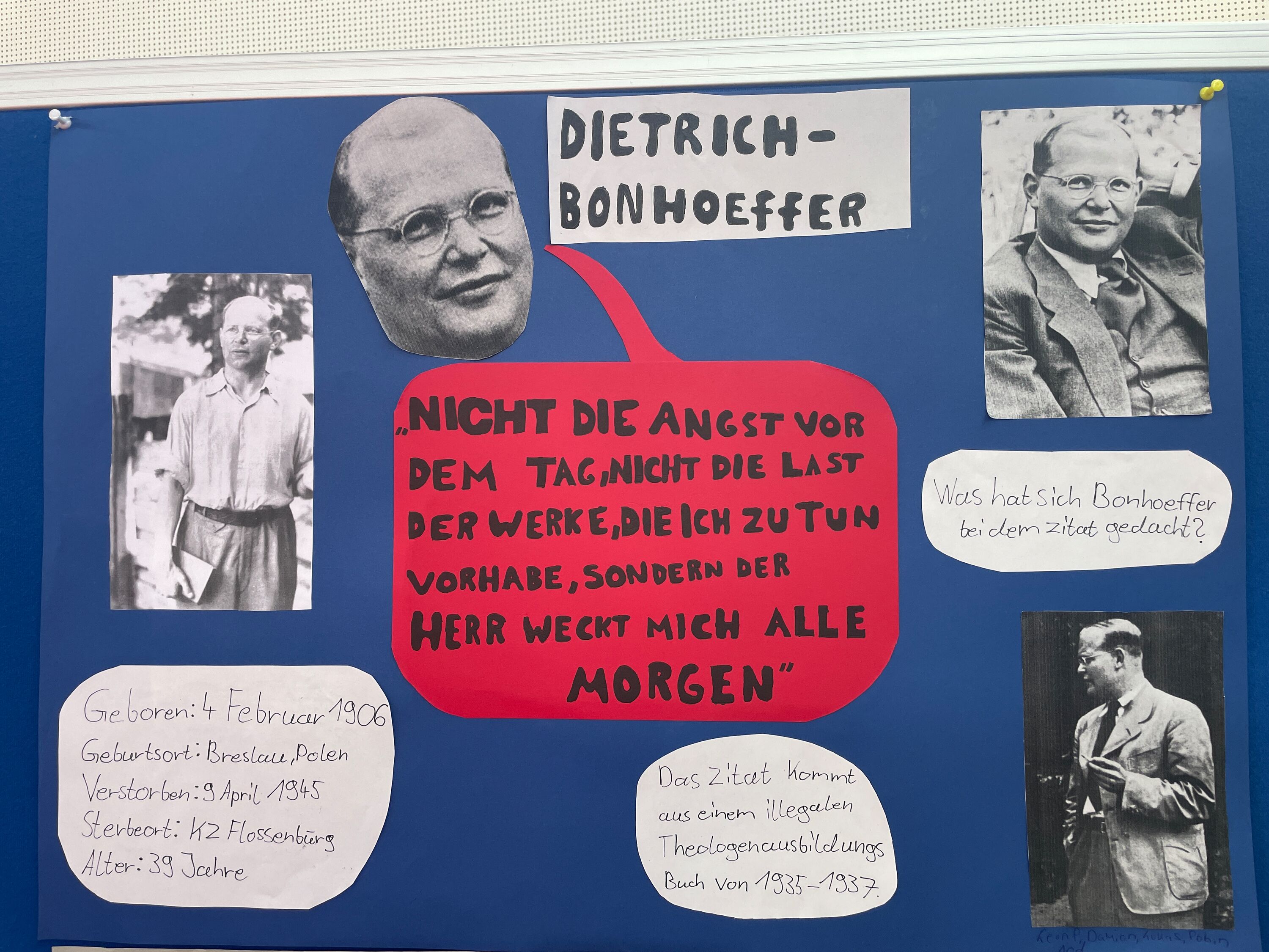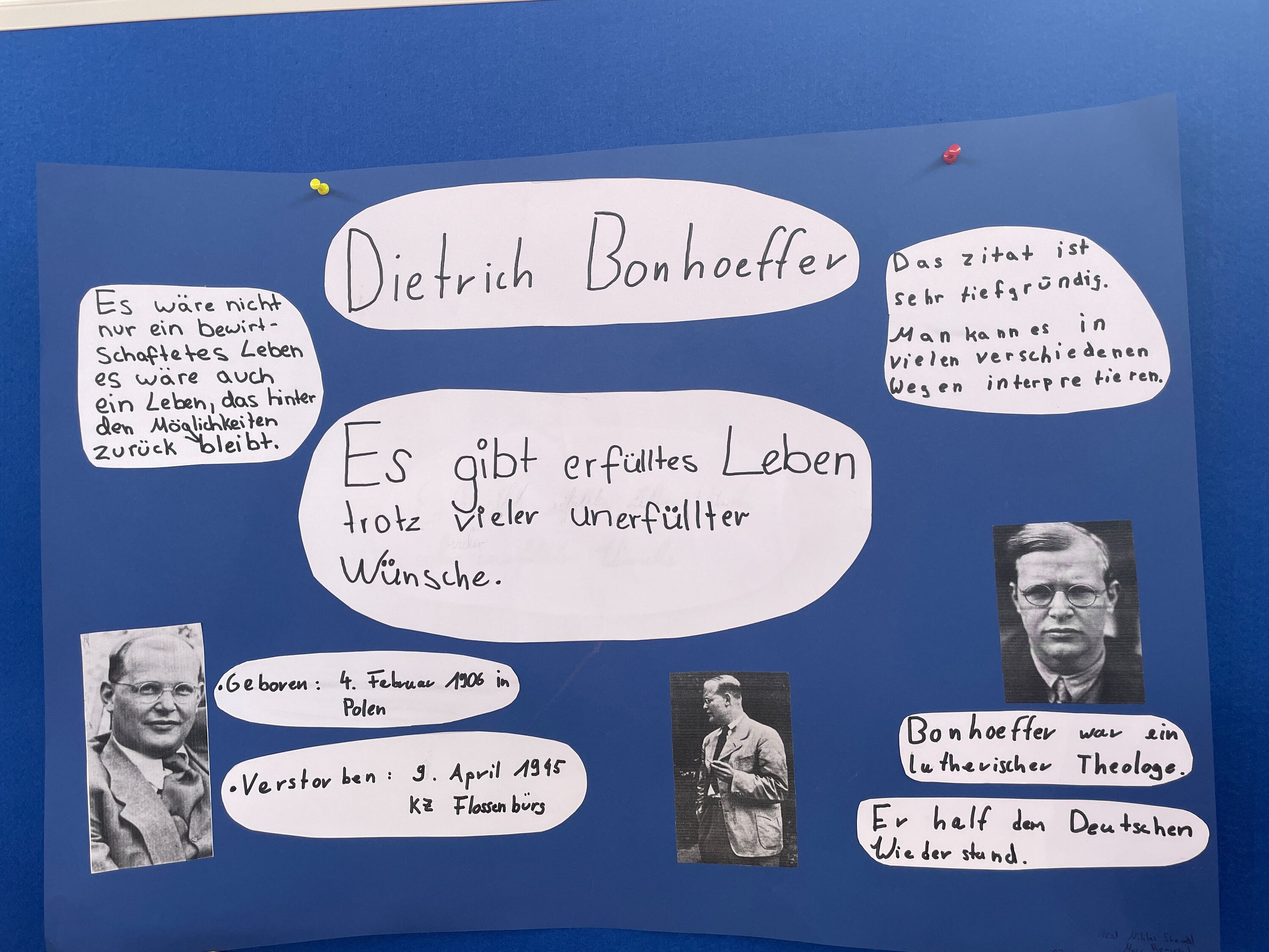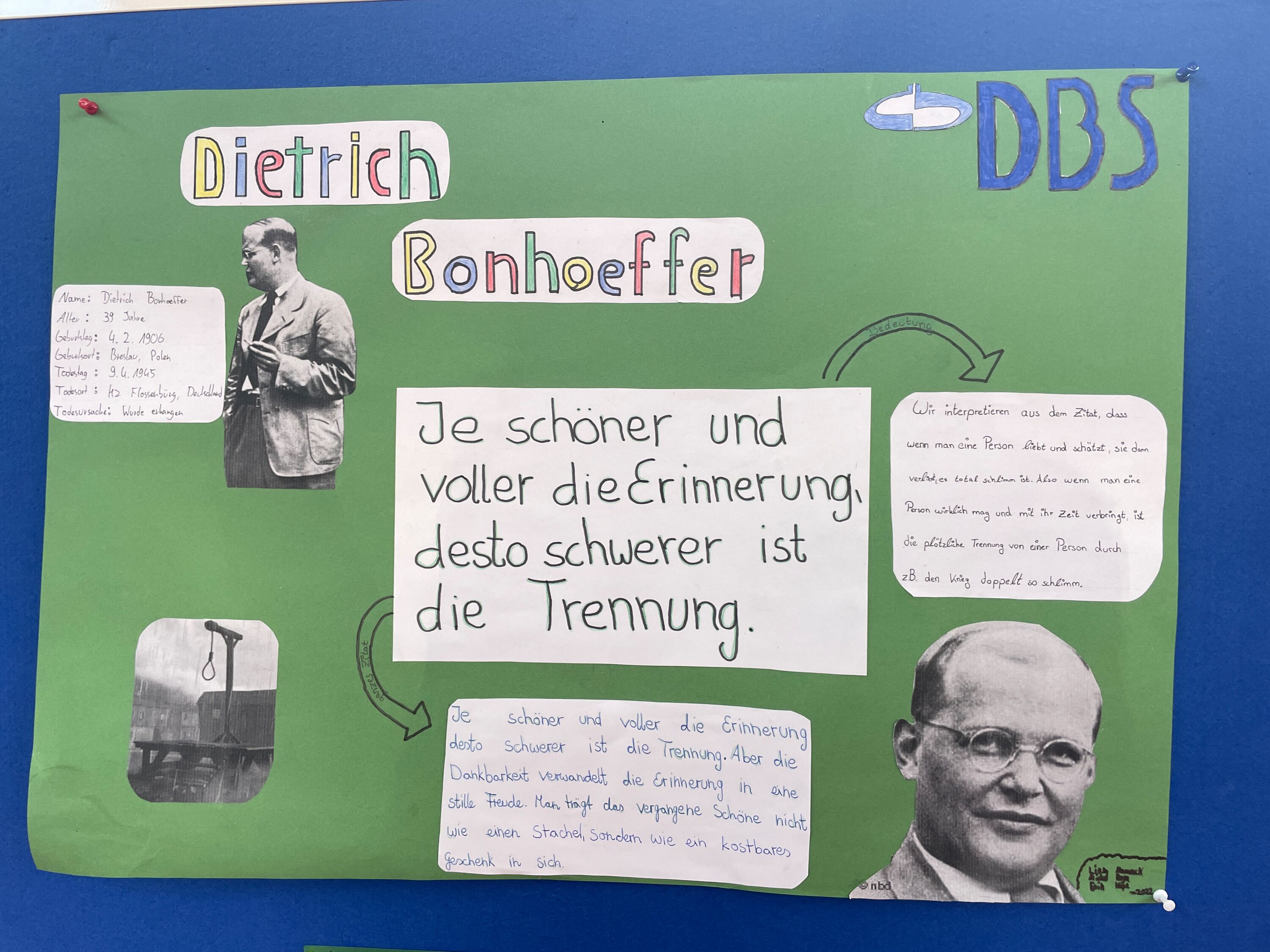Eine Gruppe sagte ganz deutlich, auch die jüngeren Schülerinnen und Schüler der Schule sollten schon mehr über Bonhoeffer erfahren. Da haben sie völlig recht, war die einhellige Meinung. Lieber 10. Jahrgang, vielen Dank, ihr habt mit eurer Arbeit einen wichtigen Beitrag dazu geleistet!