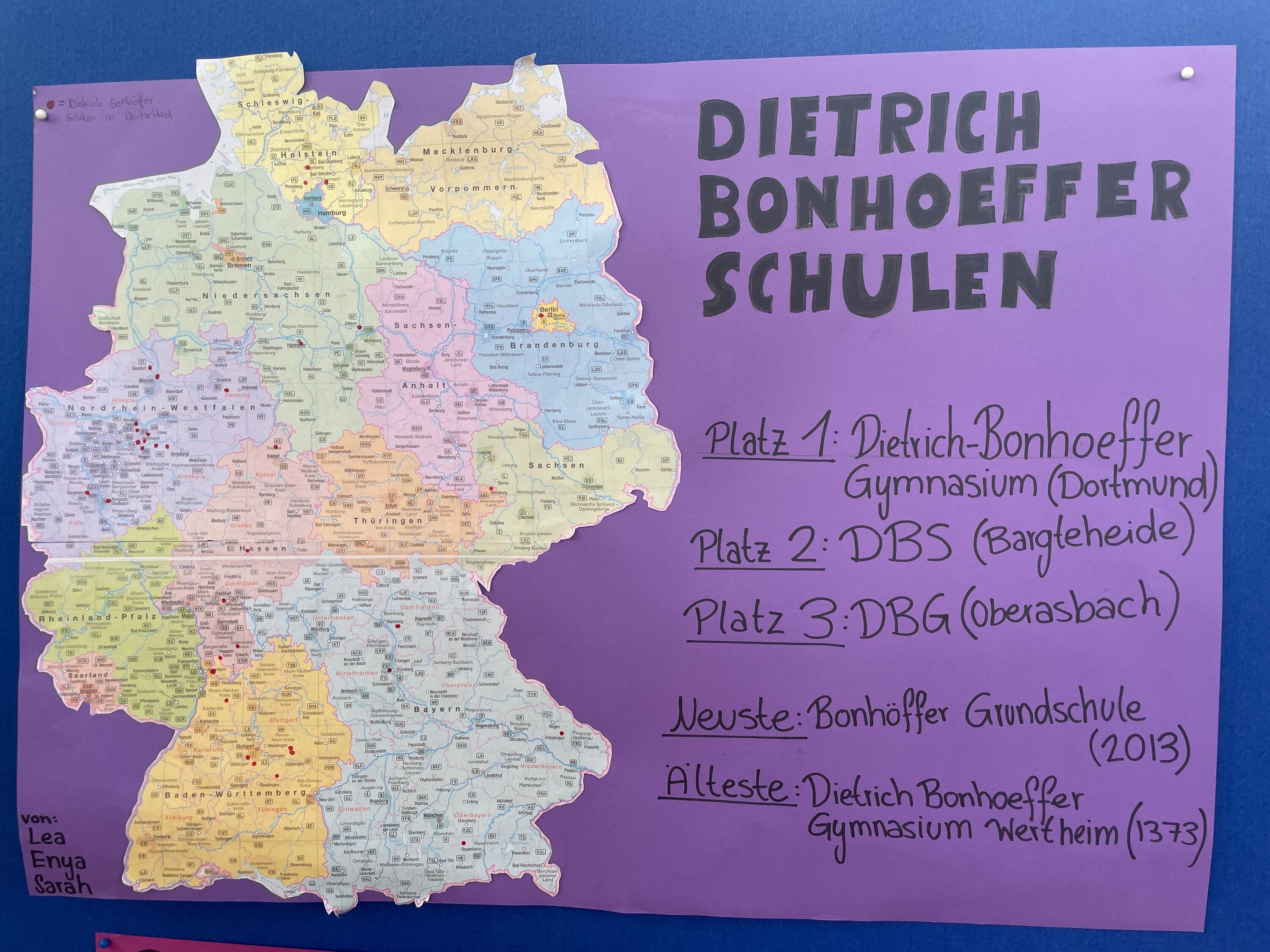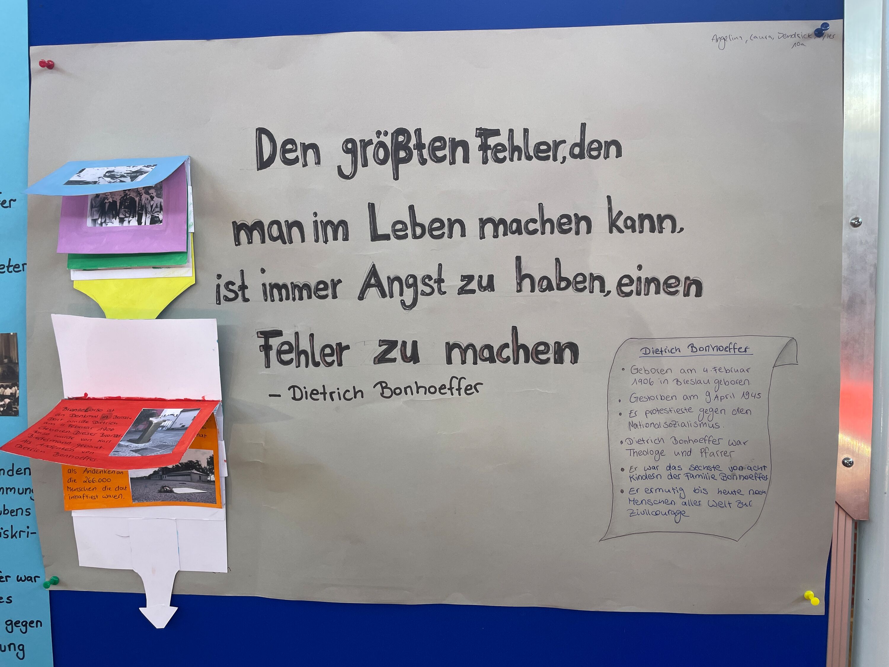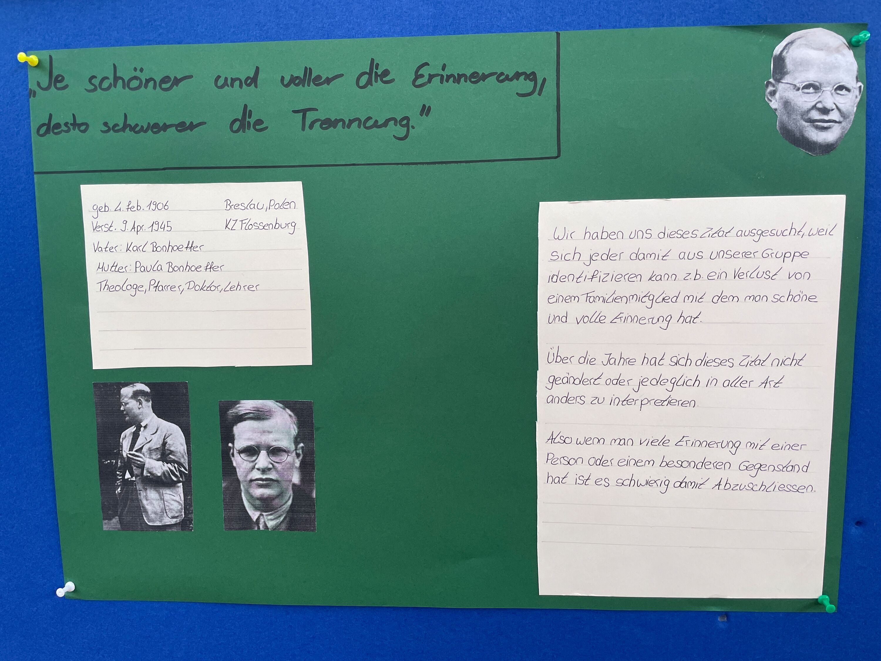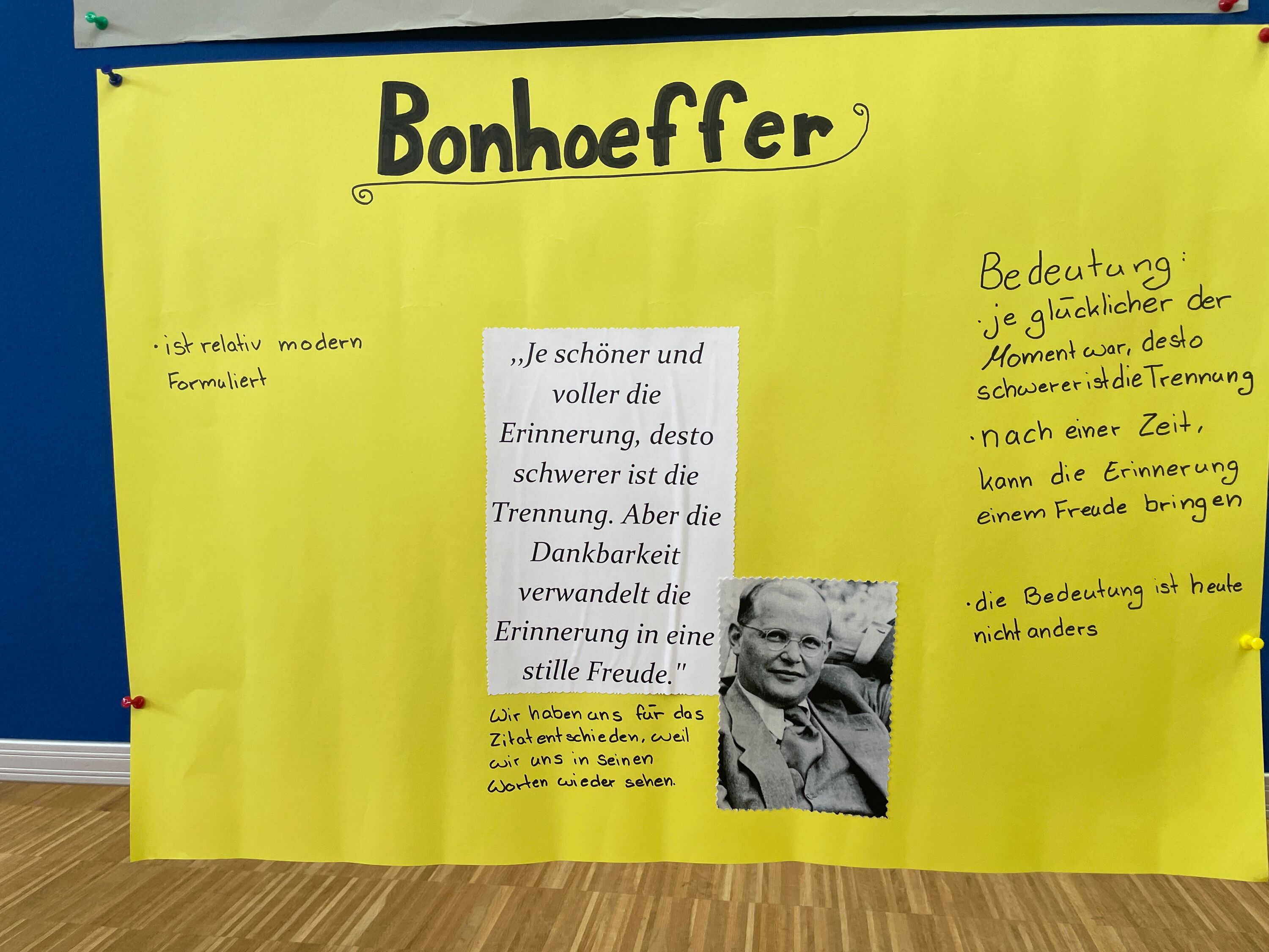 Eine Gruppe sagte ganz deutlich, auch die jüngeren Schülerinnen und Schüler der Schule sollten schon mehr über Bonhoeffer erfahren. Da haben sie völlig recht, war die einhellige Meinung. Lieber 10. Jahrgang, vielen Dank, ihr habt mit eurer Arbeit einen wichtigen Beitrag dazu geleistet!