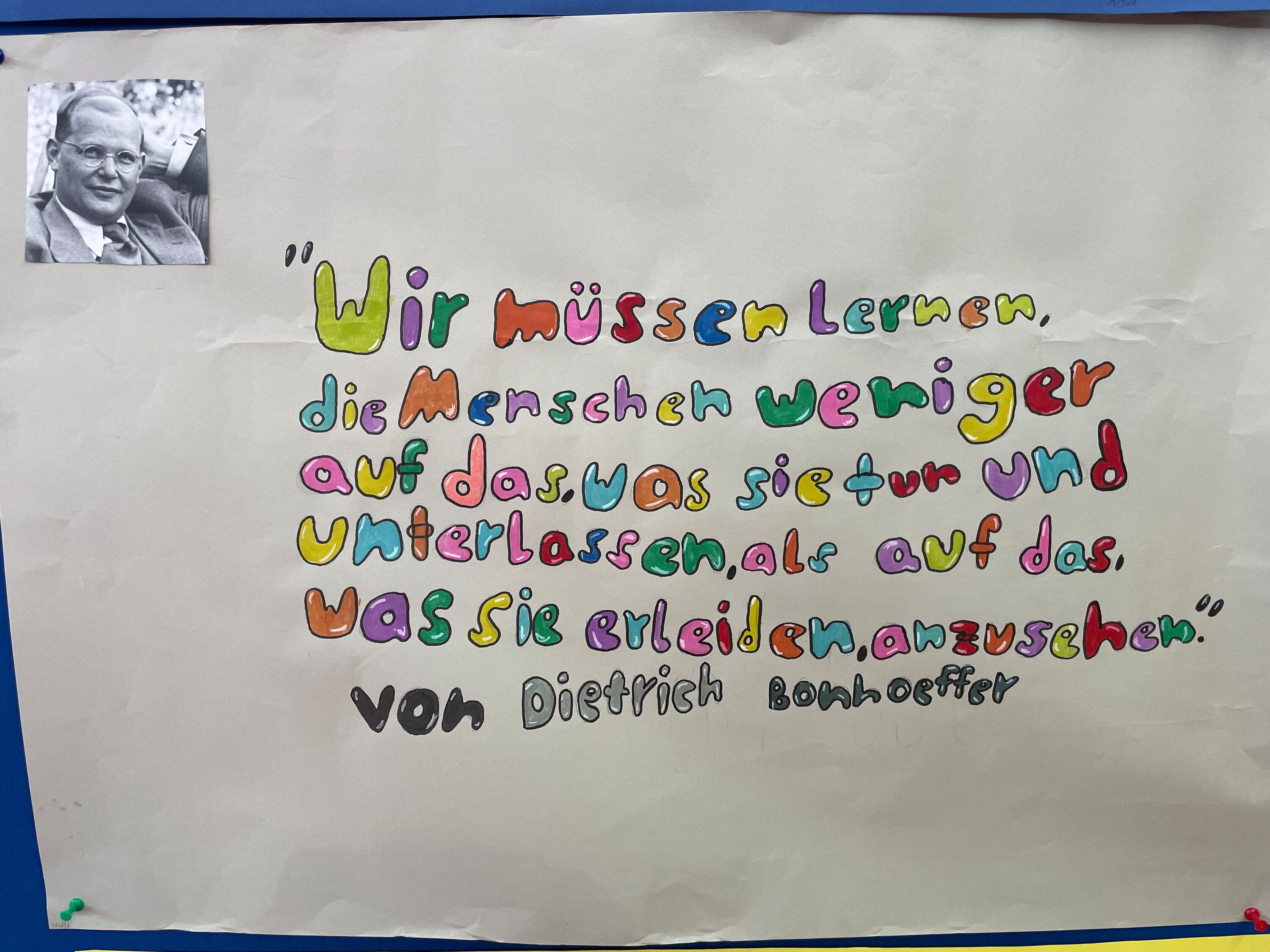 So standen dann auch die Schriften Bonhoeffers im Vordergrund der Projektwoche. Die Schülerinnen und Schüler suchten sich in Kleingruppen jeweils ein Zitat von ihm aus, dass sie besonders bewegt, und setzten sich damit kreativ auseinander.