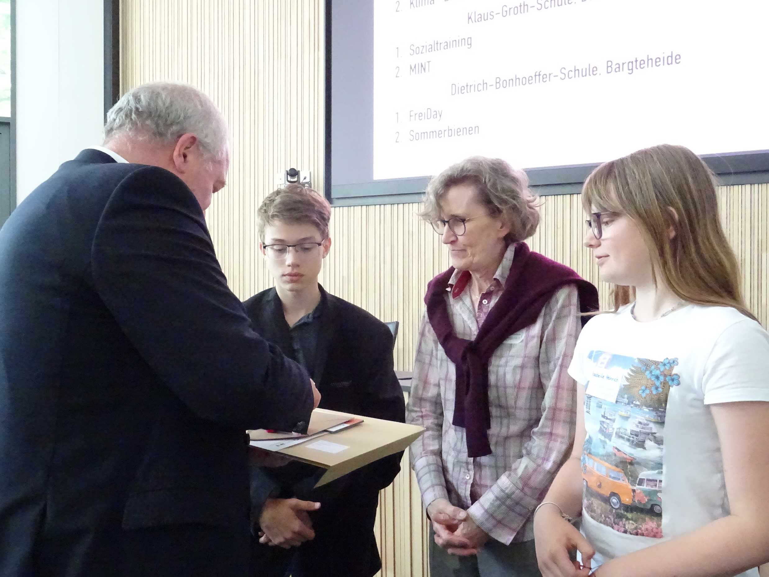 Die feierliche Preisverleihung fand in Bad Oldesloe statt. Frau Bergemann sowie Isabelle (Klasse 6d) und Milo (Klasse 6e) nahmen die Auszeichnung stellvertretend für die Schule entgegen.