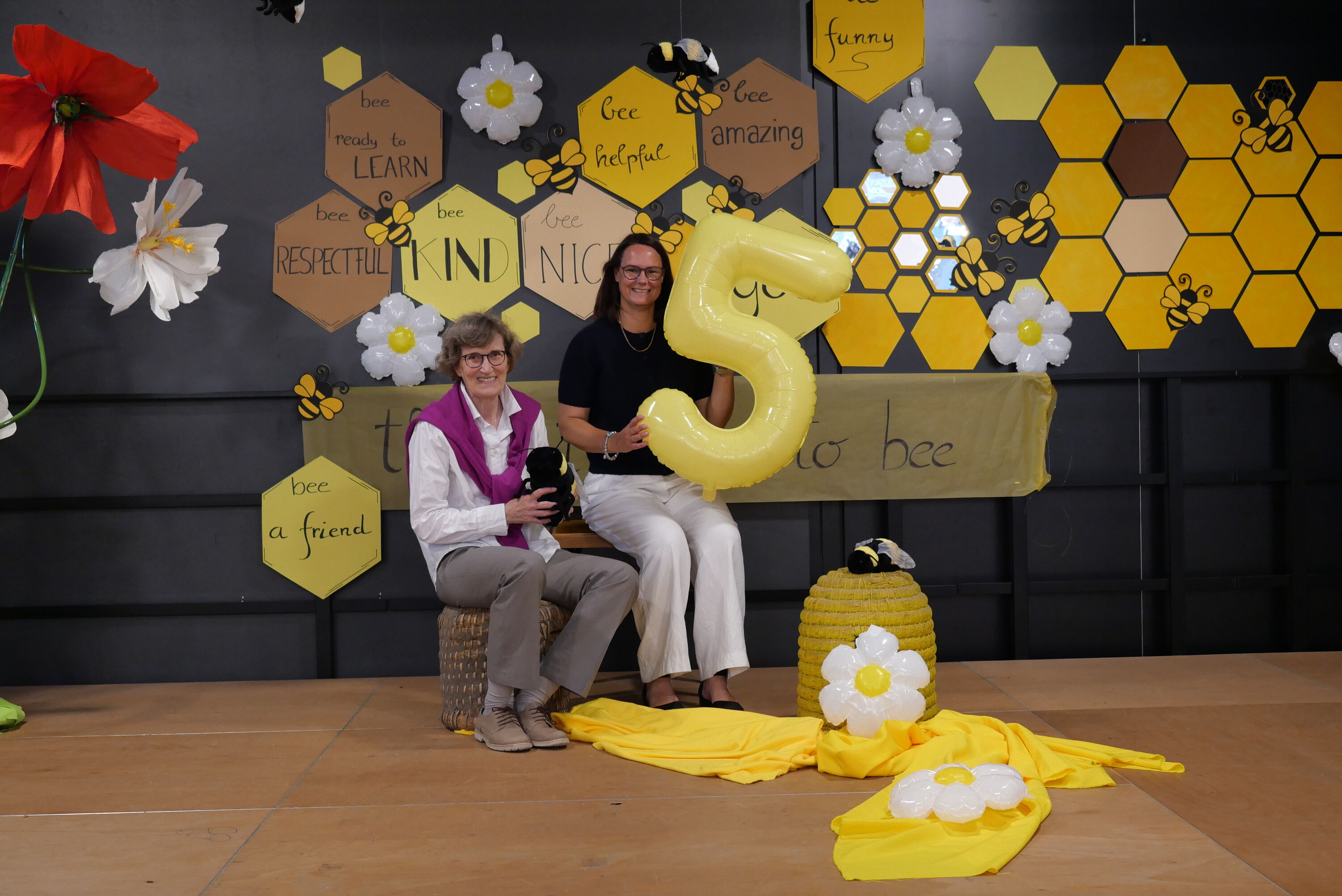 Am Dienstag, den 9. September 2025, war es endlich so weit: Unsere neuen 5. Klassen wurden eingeschult! In der Aula summte es fast wie in einem Bienenstock – kein Wunder, denn die bunte Bienendekoration auf der Bühne erinnerte an das Schulprojekt „Sommerbienen“.