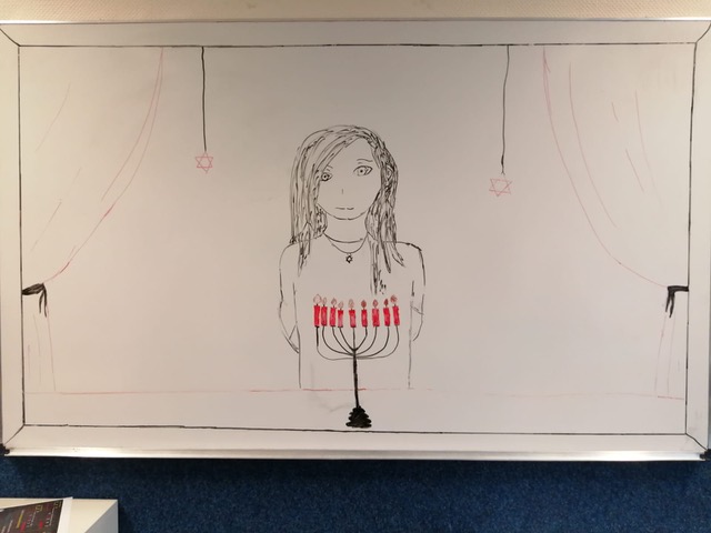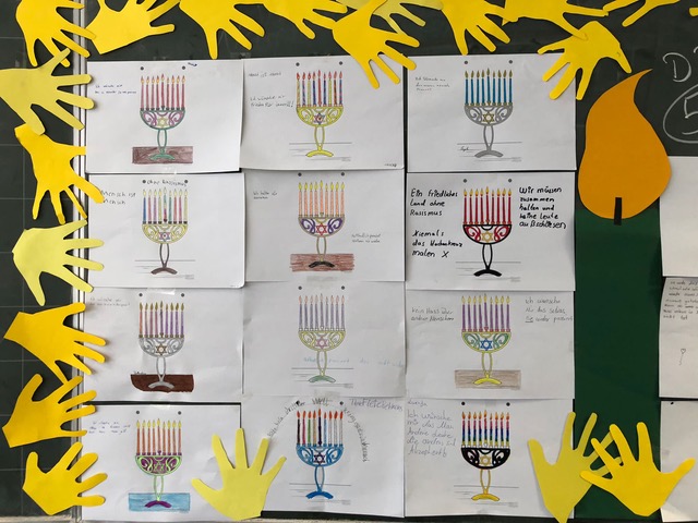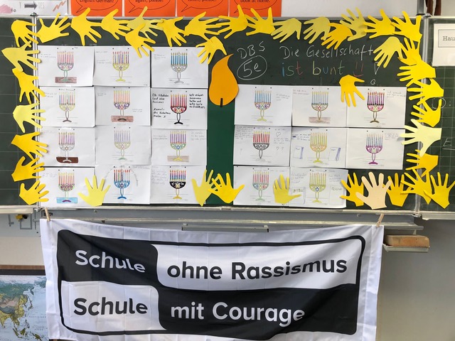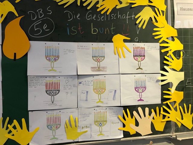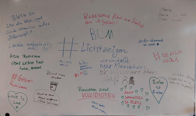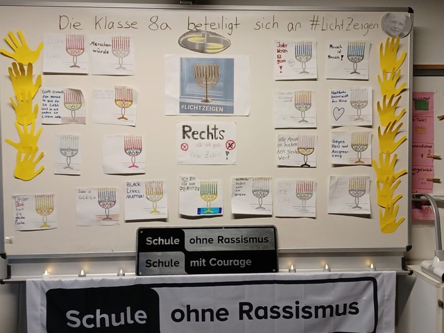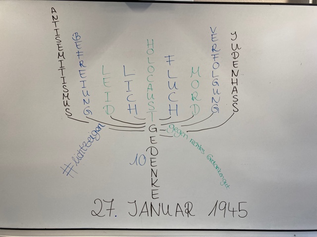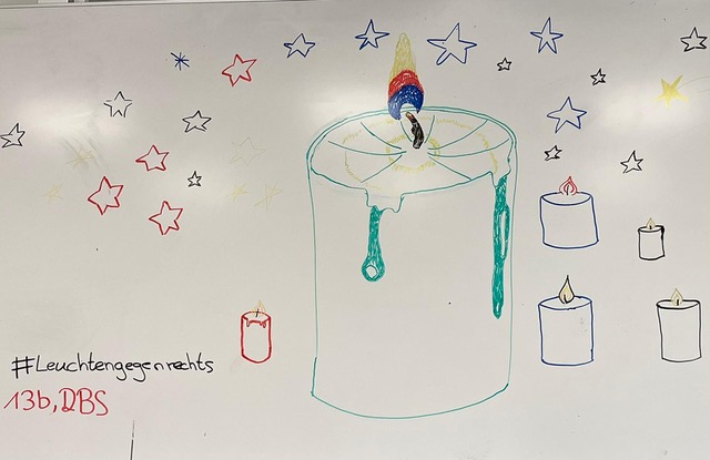 Neben den Momenten des Gedenkens und Gesprächen in den Klassen entstanden auch Tafelbilder. Als "Schule ohne Rassismus, Schule mit Courage" und dem Namensgeber Dietrich-Bonhoeffer, der selbst Opfer des Nationalsozialismus wurde, war es Schülerinnen und Schülern sowie Lehrkräften ein Anliegen durch die Teilnahme an der Aktion ein Zeichen gegen Hass und Gewalt zu setzen.
