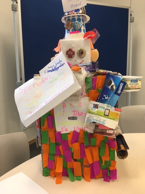In ihrem Projektunterricht befassen sich die Schülerinnen und Schüler des 5. Jahrgangs unserer Schule zurzeit mit dem Thema Nachhaltigkeit. In diesem Zusammenhang bastelten Katie, Karolin, Josie, Bendix und Fjonn aus der 5b einen Roboter aus Müll. Dieses lustige Kerlchen gelang ihnen super, sollte aber auch unbedingt noch eine sinnvolle Aufgabe bekommen. Da kam den 5 Klassenkameraden*innen diese tolle Idee: „Der Roboter wird ein Spendensammler!“. Schnell bekam er vorn einen Schlitz zum Geldeinwurf und hinten eine Klappe, um wieder an die Spenden heranzukommen. Es wurde nicht lange gewartet und Katie, Josie und Karolin machten sich auf den Weg in Bargteheides Innenstadt. Dort sammelten sie in den Geschäften mit Hilfe des Roboters Spenden für unseren Schulverein. Dafür teilten sie auch Flyer einer Buchhandlung aus und gossen die Blumen eines Blumengeschäftes. So kamen 14 Euro zusammen, die im Rahmen einer Spendenübergabe in der letzten Woche von Katie, Karolin, Josie, Bendix und Fjonn an unseren Schulverein übergeben werden konnten.